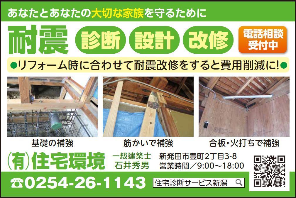 住宅診断サービス新潟「運営(有)住宅環境」は新築・既存木造住宅・中古住宅を対象とした住宅診断・検査及び耐震改修も行う一級建設士事務所です
